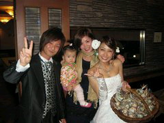 前にも紹介させていただきましたが、和歌山にいる僕のいとこのえいくんこと、栄作君と、かおりさんが、先日ついに結婚式を挙げました。 いやいや、小さい時からいつも一緒に遊んでた、えいくんと、弟のかっかん。 そのえいくんが、結婚か、。 奥さんのかおりさんも、とっても素敵な方で、幸せそうな二人を見ると、嬉しくなります。 なんかしみじみ、世代って本当に、こうやって交代していくんだなぁと、感じました。 えいくんは子供の頃からのイメージが強いから、そのうちパパになるんやろなぁとか考えると、 いやぁ、笑うわ。 子供に 「あかんでぇ!!」 とか、かん高い声で怒ってる姿が浮かんできて、笑ってしまうんです。 もちろん、とっても幸せな笑いですよ。 ちなみに、、 僕はパッチギ稽古の真っ最中なんで和歌山に帰れなかったので、残念でした。。 写真は、えいくん夫婦と、僕のおかんと、 もう1枚はお姉と久々桃ちゃん。 でかくなりましたわぁ、桃ちゃん。 てかすいません。 身内ネタオンリーで。 まぁ一生に一度のことなので、今夜はえいくんかおりちゃんをこのブログでも祝したいと思います。 そんな幸せパワーで元気をもらって、明日からも稽古、頑張りまーす!!