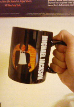 さて皆様、多数のチケット依頼のほど、誠にありがとうございます!! 予約が確認されましたら、各希望者の皆様に、それぞれ結果をお送り致しますので、今しばらくお待ち下さいませ!! そして、こんなマグカップをゲット致しました~。 マイケルの、しかもオフザウォールの写真入りマグカップ。 うーん、これでコーヒー飲むと、毎朝テンション上がるなぁ~。 いちいち 「ダッ!アッ!」 「フォーー!!」 て言いながら、朝のコーヒータイムを楽しみたいなと思いまする。 調子にのると、熱いコーヒーがこぼれて、リアルに 「アツッ!!」 て叫んじゃうので、よい子の皆さんはマネしないようにね♪