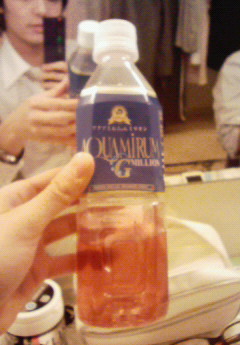 今日劇場入りして、差し入れの水をいただこうとしたら、これがありました。 まず、色が赤い。 ワインみたいなんです。 なんだこりゃと思って原材料を見てみると、なんと、金が入ってるんです。 おそるおそる飲むと、ふっつーーの水の味。 つよぽんも、スタッフさんも 「いや、この水すげーよ。高いし。」 とおっしゃるので、何がすげーのか、健康食品研究会世田谷支部副係長(嘘)の久保さんに聞いたところ 「いや、すげーんだよ!体にすげー良いんだよ!姉貴も飲んでたもん!」 と教えていただきました。 体にすげー良いのかぁ。 スポーツ科学のパイオニアであるPHITENが作ってるからなぁ。 今日はこれ飲んで、すげー張り切ります!!