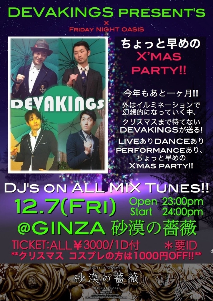 今日はそこそこ暖かかったですね! さてはて、 7日のイベントも、間もなくでございます。 今回、DEVAKINGSとしてのネタは、 相方のSHINZOナンバーとして、 6人で、踊ります。 選曲、振り付け、全て、SHINZOプレゼンツ! 彼のワールド、炸裂ですよ〜。 このネタ、気に入ってます。 では 当日の出演者について、前回発表させていただいてから追加もありますので、書かせていただきます! まず、りょうちゃんこと、小林遼介氏の歌、 これは、間違いないです☆ 是非、癒やされて下さいませ。 そして、同級生のギタリストのKAORU。 reminderというバンドで、インディーズデビューもしているのですが、 彼と、今回ソロでヒューマンビートボックスをぶちかましてくれる、ビートボクサーのPAKU君とのコラボセッション、そして、そこに僕達も交ざってセッションしちゃおうと思っております。 また、ハイパーテクニシャンタップダンサーの、あだちゆうき君のタップに口をあけていただき、 パフォーマー脇田伸悟氏の様々な技に、これまた口をあけていただきたいと思います。 ダンサーとして、 現役大学生ダンサー2人組の、ナムルとまちこ。女性らしいダンスをかましてくれます。 たかてぃす さんには、ソロで、POPというジャンルのダンスで、グイグイムーブしちゃってもらいます。 そして、大学生イベントで、数々の賞に輝き、先日も、大学生東京NO.1を決める大会、BIG BANG東京にて見事優勝を決めたSUNNY BEATSの中から、 うえの がソロでロッキングをかましてくれます。 うえのは、高校生の時、僕の教え子でした(^O^) ロッキングは、一切教えてないですけどね☆爆 また、スタジオの仲間とえつやと僕との4人でのチーム、home sweet homeでは、そうですね、楽しく踊ります☆笑 そんな出演者でお送りします、FRIDAY NIGHT OASIS×DEVAKINGS。 7日の夜は、銀座砂漠の薔薇へ、お気軽にお越し下さいませ☆