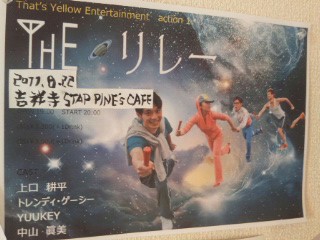 えー、先日挑戦させていただきました、That's Yellow Entertainmentという名の仲間達でのライブ、「THE リレー」、、 早くも追加公演が決定致しました! 更にパワーアップできるよう、頑張りまっス! では詳細です!↓ That's Yellow Entertainment action.1 【THE リレー】 2011年 8月22日(月) 吉祥寺STAR PINE'S CAFE (東京都武蔵野市吉祥寺 本町1丁目20-16) tel→ 0422-23-2251 open 19:00 start 20:00 〔前〕3,300(+1drink) 〔当〕3,600(+1drink) CAST 上口耕平 トレンディ・ゲーシー YUUKEY 中山眞美 チケットご予約の方は、 名前・人数・ メールアドレスを記入の上、 こちらへメールしてください。 ↓↓↓↓↓ yellow_entetainment @yahoo.co.jp 確認取れ次第 返信させていただきます! 夏真っ盛りの中でのライブです! ゲーシーの汗にはご注意を! よろしくお願いします~☆