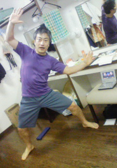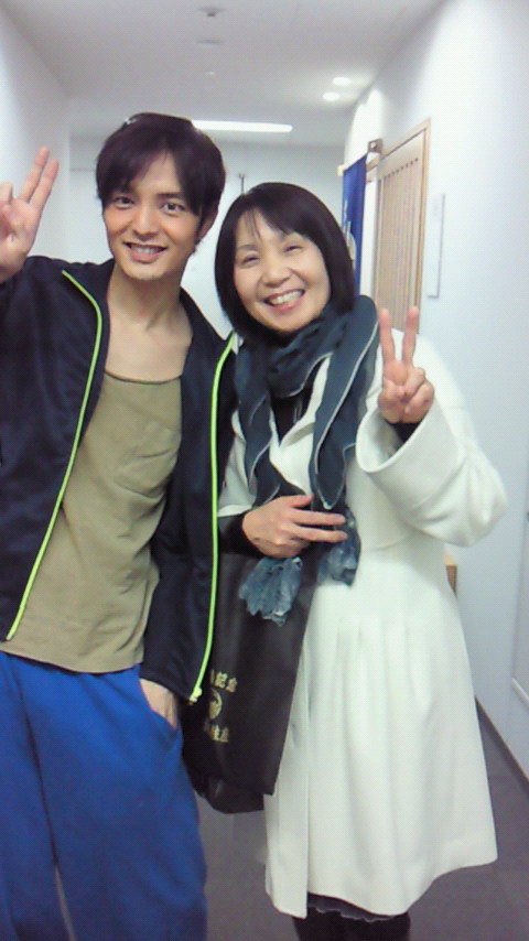 ターボジャムとは、ブートキャンプとかコアリズムのような、エクササイズDVDのひとつです。 父上のエクササイズ好きを知ったのは稽古中のこと。 ある日の稽古中、開脚して胸も地面にぺたーーっとつけてストレッチしてる父上を見て、 「身体柔らかいんですねぇ!何かやられてたんですか??」 と聞いたのがキッカケ。 特にダンス等をされているわけではなく、肉体を磨くことがお好きなようで、毎日ストレッチは欠かさずやっていて、先日までは毎日コアリズムをやっていたそうです。 その時に、 「最近ねぇ、人に教えてもらったんだけど、ターボジャムってのがあるんだよぉ! これね、すごい効くよぉ!大阪入ったら、見せてあげるね!!」 とおっしゃっていて、 どんなものなのか楽しみにしていました。 そして、大阪入りして、幕が開き、先日いつもより早めに楽屋入りしたところ、 ほぼ誰もまだ来ていないのに、 父上の楽屋から 「ジャブ!ストレート!ジャブ!ストレート!キック!そう!素敵よ~!」 みたいな女性の元気な声と、とにかくテンション高いBGMが聞こえてきました。 まさか! と思い楽屋を覗くと スポーツウェア姿の汗だくな父上が朝イチからターボジャムをがっつりやっていました。 声はDVDプレイヤーから流れるインストラクターの声でした。 その次の日から、僕も朝イチ父上の楽屋にお邪魔し、ターボジャムをご一緒させていただいているんです。 これが結構キツくて、身体全体を締めるエクササイズと、腹筋プログラム、計40分くらいやるのですが、終わったら腹が結構痛くなります。 良いです。 てか、父上も僕も基本テンション高いので 二人して朝から 「フォー!」 「イェー!」 「まだまだぁー!」 とかDVDの掛け声に合わせて声出しまくっているので、 何人かの方が 「何やってんの、、?」 て顔で覗きにいらっしゃいます。 父上の発汗作用が凄まじいし、めちゃくちゃ元気に動かれるので、隣でやっててすごい楽しいです。 良いアップになるので、ターボジャムを広めようという話になり、明日からはロビーでやることになりました。 ただ、父上の持ってきているDVDプレイヤーは小さい物なので、ロビーでみんなとやるとしたら、 父上がインストラクター的な感じになるのかな。 それはまた、楽しそうです。 さぁ! 明日も朝からターボジャム! 頑張りま~す! おやすみなさい~ ちなみに写真は、ターボジャム中の父上です。