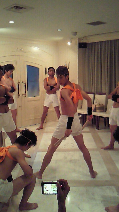 披露宴はちょうどabc本番中でしたので出席できなかったのですが、本番終了後すぐさま駆け付けて、二次会には参加できました。 もう、、、 最高。 やっぱ、さすが兄貴です。 アホすぎです。 新郎がこんなにマイク持って盛り上げまくる二次会なんて見たことないです。 元気が出るテレビ風なクイズとか、バリバリ司会がしんじさんでした。 こんな○○は嫌だ! コーナーの、 「こんな結婚式は嫌だ!」 のお題の答えでちょっと面白かった人は、 ボードに新郎新婦の絵を書いて、その横にもう一組新郎新婦の絵を書いて、 「次の回の新郎新婦がもうスタンバってる。」 て答えた人です。 センスありますよね。 いやはや、本当に楽しい会でした。 心から、お祝い申し上げたてまつりたいと思います。 写真は、新郎新婦入場の際のワンシーン。 しんじさん筆頭に、その仲間の方達、みんなお祭りスタイルで登場し、 この後兄貴は、エア和太鼓を堂々とぶちかまし、綺麗なドレスを着た奥さんを迎えいれました。 そして、マイクを取り、 「せいやっせいやっ!!」 て叫びながら取り巻きに高々とかつがれて退場しました。 なんのこっちゃ。 いやぁ、本当に最高です。 しかもその後、何食わぬ顔で、普通にスーツ着て入ってきて普通に座りましたからね。 そんな兄貴のお子さんが早くみたいです。 以上、荒井信治兄貴の結婚報告でした。