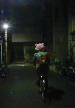 座長を応援してきたのです。 いやぁ、楽しかったです。 あんなライブ会場になってるクリエを初めて見たので、衝撃でした。 だってオールスタンディングですよ。 もうノリノリ。 ガイズの三年後っていう20分くらいの芝居も、結構笑いました。 さすが、関西人やね。 クリエがもう懐かしく感じた、こぶ兵でした。 さてさて、またちょっとえつやネタですが、 先日、自分の誕生日の時にキャストのみんなからいただいたプレゼントの中に、かわいいピンクのクマの被り物があったのですが、 えつやが家に遊びに来た時に、どうやら気に行ったみたいで、少し貸してあげることにしました。 見て下さい。 被ったままチャリに乗り、家へと帰って行ったのです。 本当にバカです。 職務質問されたら呼べよ、とだけ伝えて、彼は夜道へと消えてゆきました。 (次の記事へ続く。)